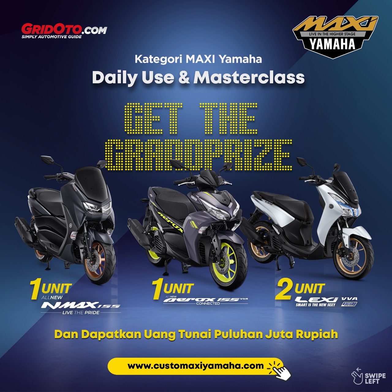 Akan hadiah menarik buat peserta yang berhasil menjadi pemenang Online CUSTOMAXI 2021 diantaranya satu unit All New NMAX Connected, satu unit All New Aerox Connected, dan dua unit Lexi Standar serta jutaan hadiah lainnya. Pendaftaran akan dibuka hingga 27 November 2021 mendatang.