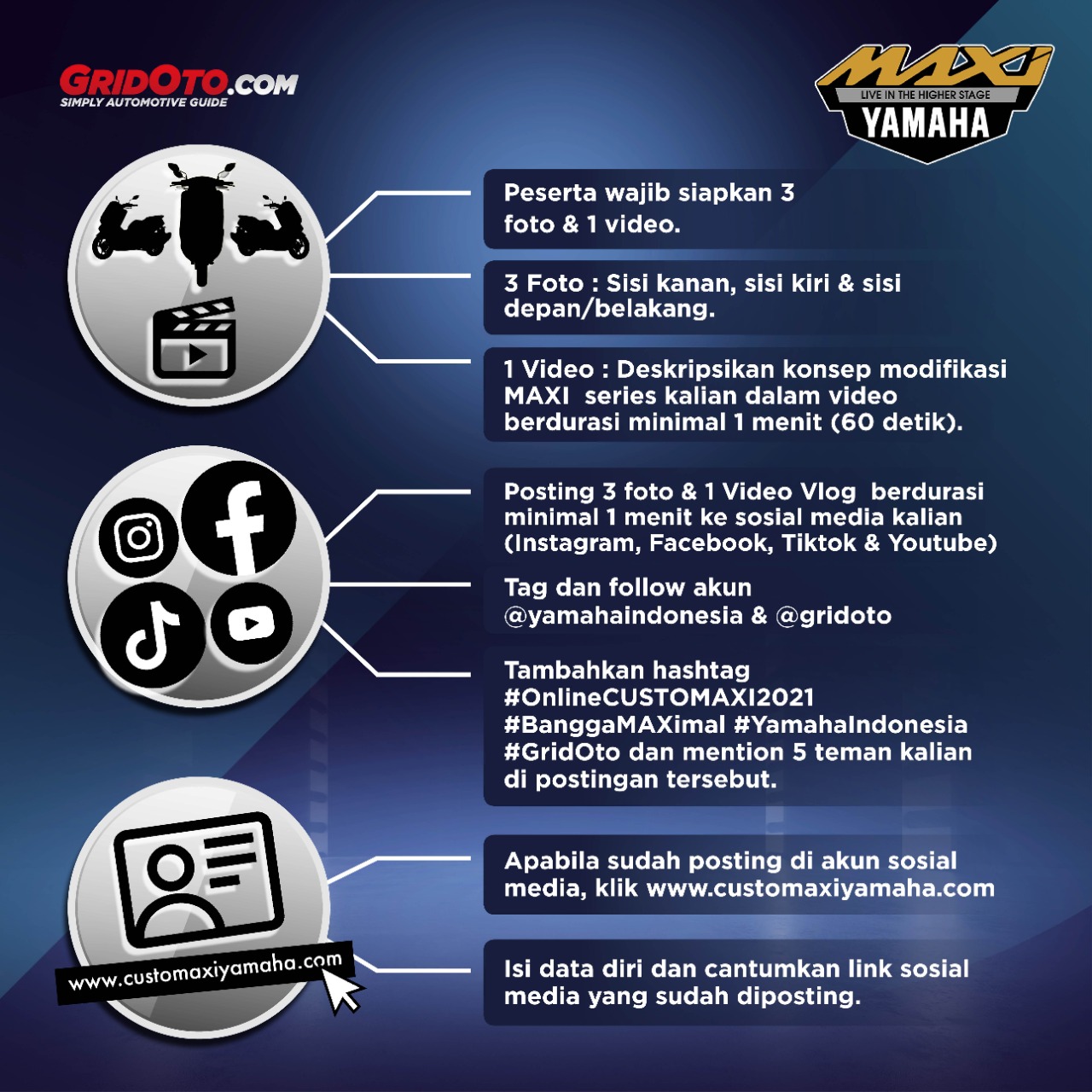 Usai melakukan pendaftaran, unit yang sudah di modifikasi harus di foto pada bagian sisi kini dan kanan motor serta bagian belakang motor. Foto di upload ke media sosial pribadi peserta (Instagram, TikTok, YouTube) dengan menyertakan hastag #OnlineCUSTOMAXI2021 #BanggaMAXIMAL dan tag ke lima teman. Peserta juga harus tag dan sudah follow akun Instagram @yamahaindonesia dan @gridoto.
