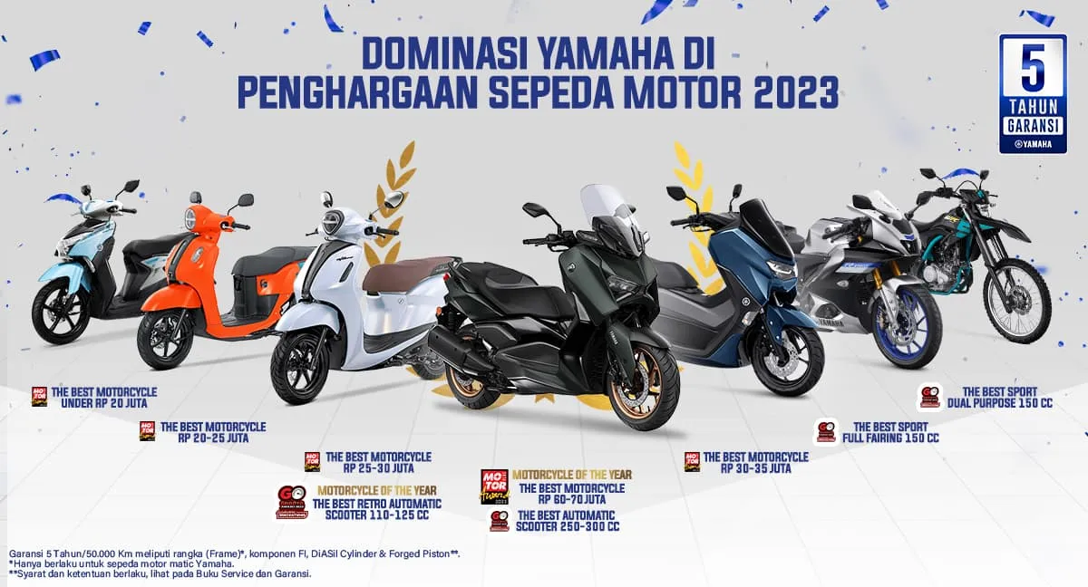 Pencapaian ini menjadi hal yang layak untuk diapresiasi mengingat salah satu penghargaan yang didapat oleh Yamaha merupakan Award yang paling prestisius di event tersebut, yaitu Motorcycle of The Year (MOTY) 2023 yang dinobatkan untuk motor di jajaran skutik CLASSY Yamaha, yaitu Grand Filano Hybrid Connected. Menariknya, di tahun 2022 lalu skutik Fazzio Hybrid Connected juga turut menyabet gelar tersebut di ajang yang sama.