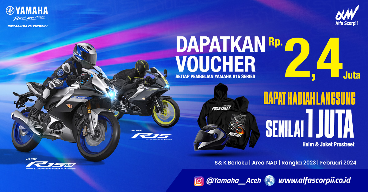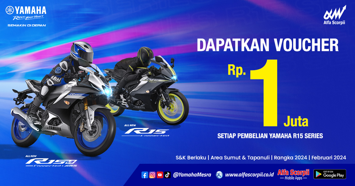 Untuk area Sumatera Utara dan Tapanuli, setiap pembelian Yamaha R15 series, konsumen berhak mendapatkan voucher senilai 1 Juta Rupiah (rangka 2024).