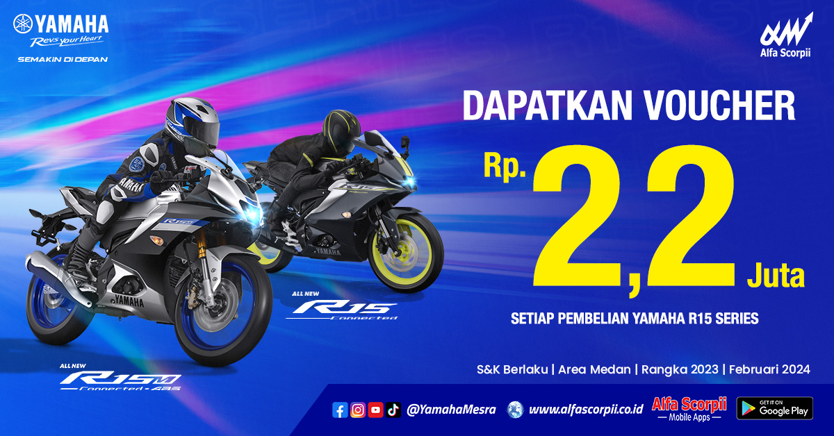 Untuk area Medan sendiri, voucher yang bisa didapatkan setiap pembelian Yamaha R15 series adalah senilai 2,2 Juta Rupiah (rangka 2023)