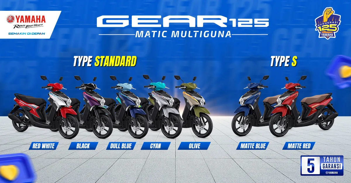 Kemudian ada varian warna terbaru pada Gear 125 Merah dengan kombinasi biru dan putih yang menampilkan kesan young dan sporty yang kuat. Berikutnya warna Cyan yang memadukan warna yang energik dengan perpaduan warna Cyan yang jadi favorite dengan warna silver.