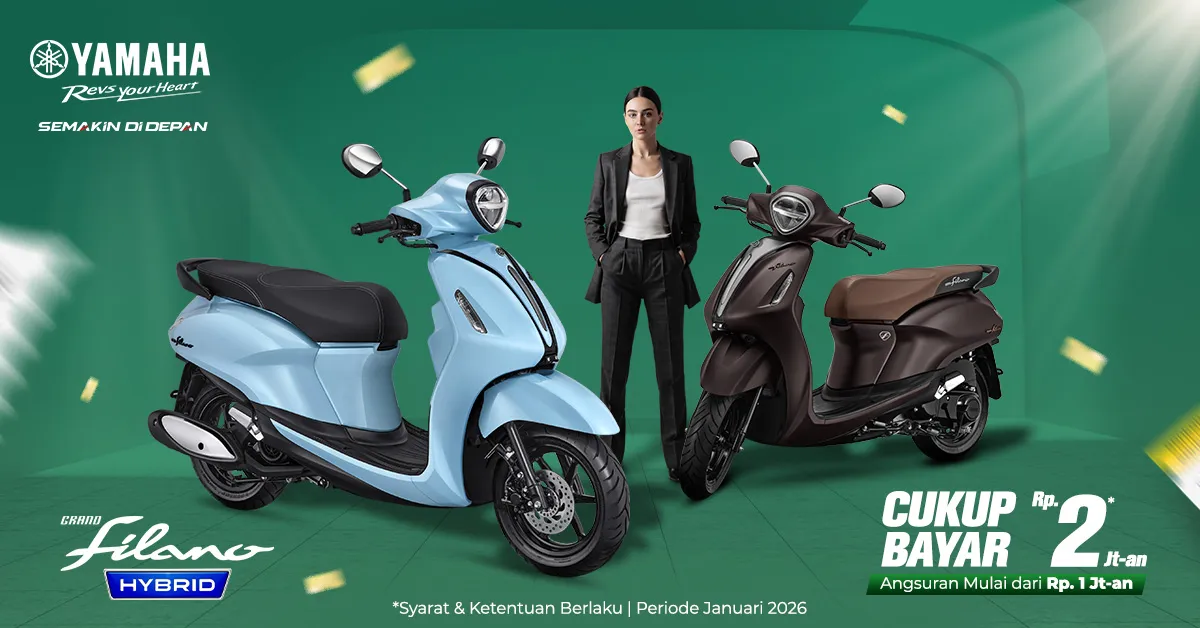 Di periode Januari 2026, Yamaha menghadirkan promo pembelian yang sangat menarik. Konsumen kini dapat memiliki Yamaha Grand Filano Hybrid dengan cukup bayar Rp2 jutaan, serta angsuran mulai dari Rp1 jutaan per bulan. Program ini menjadi solusi ideal bagi masyarakat yang ingin memulai tahun baru dengan kendaraan baru tanpa harus mengeluarkan biaya besar di awal.
